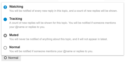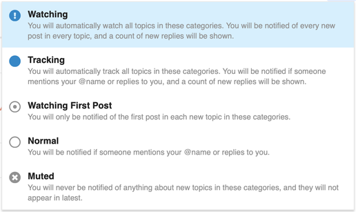 Notification level can also be set per category. To change any of these defaults, see your user preferences, or visit the category page, and use the notification control above the topic list, on the right side.